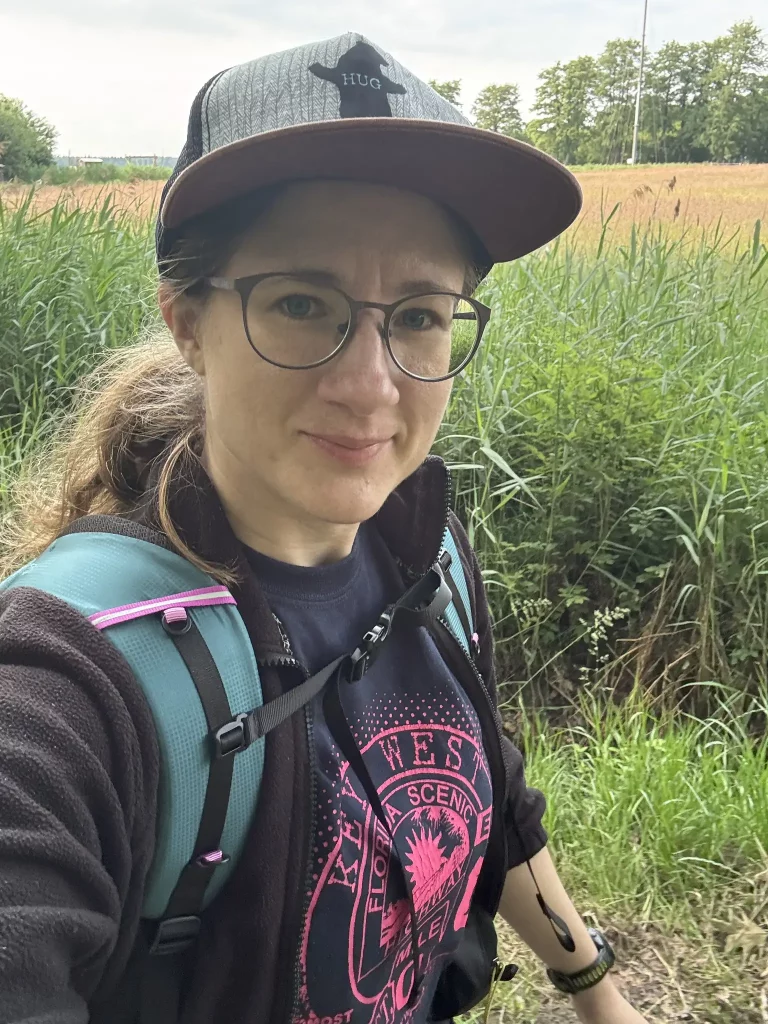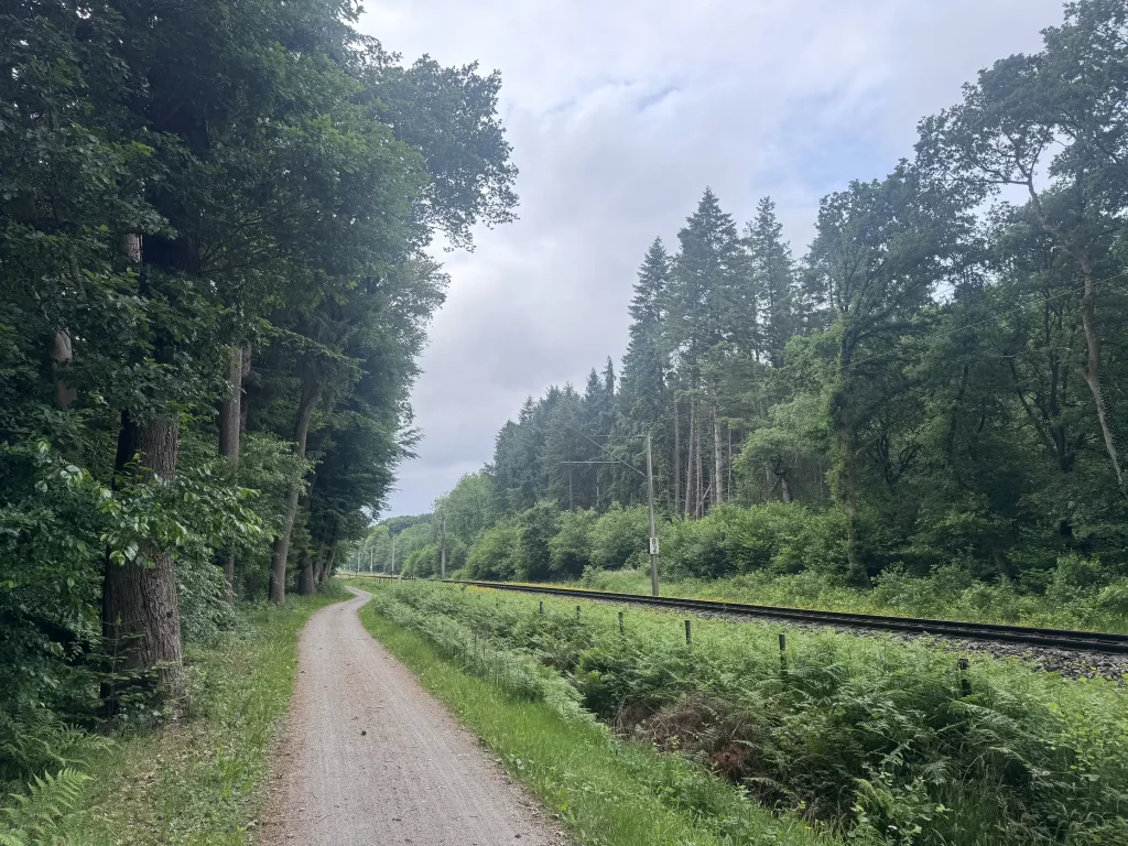 Die ersten zwei Drittel dieser Etappe führten mich parallel zur Bahnstrecke Oldenburg–Bad Zwischenahn – eine einspurige Linie mit überschaubarem Zugverkehr. Der Weg war meist ein fester Schotterpfad, gut zu gehen, dabei aber wenig abwechslungsreich. Rechts Bahn, links Wiesen oder Felder, teilweise auch dunkle Wälder, durch die ich lieber gewandert wäre.